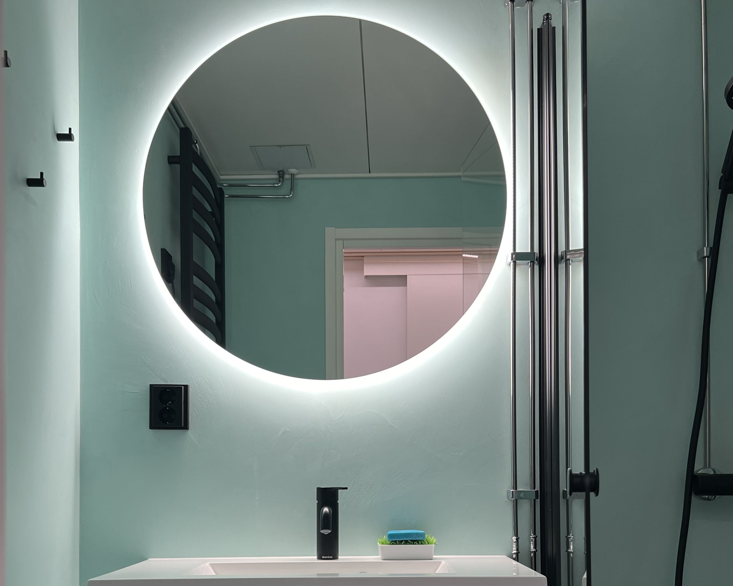 Vanha laatoitettu suihkutila päivitettiin täysin saumattomaan ja helppohoitoiseen mikrosementtipintaan. Mikrosementti tehtiin vanhojen laattojen päälle tuomaan moderniutta. Mustat suihkukalusteet ja lämmin valaistus korostavat minimalistista ilmettä ja tekevät tilasta ajattoman ja tunnelmallisen.