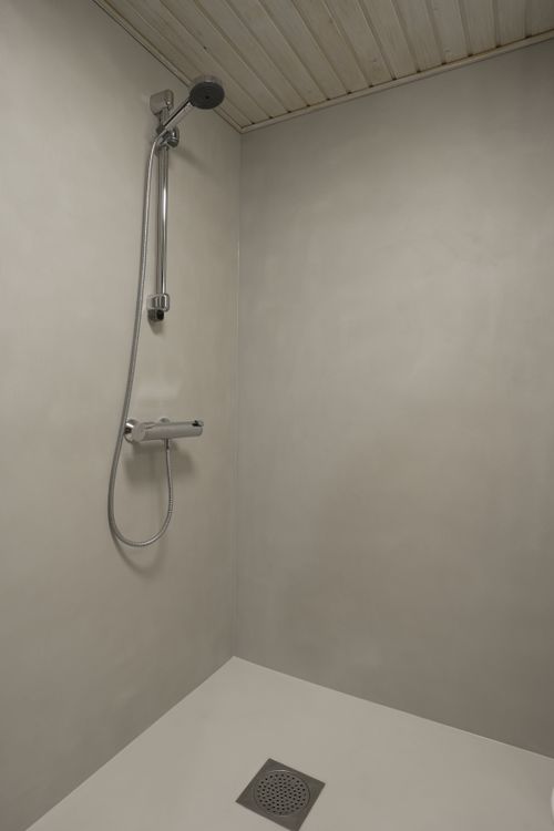 Vanha laatoitettu suihkutila päivitettiin saumattomaksi mikrosementtipinnaksi. Lopputuloksena syntyi helppohoitoinen, valoisa ja ajaton kokonaisuus, joka tuo tilaan täysin uuden ilmeen.