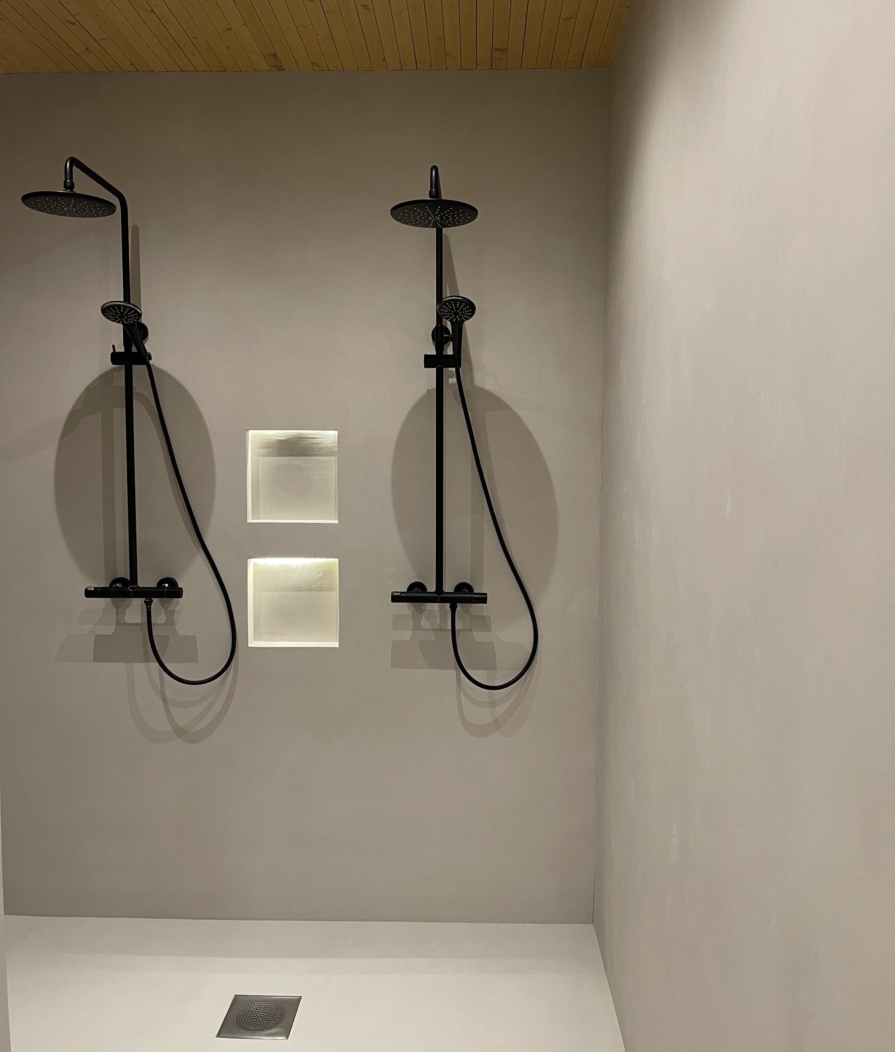 Vanha laatoitettu suihkutila päivitettiin täysin saumattomaan ja helppohoitoiseen mikrosementtipintaan. Mikrosementti tehtiin vanhojen laattojen päälle tuomaan moderniutta. Mustat suihkukalusteet ja lämmin valaistus korostavat minimalistista ilmettä ja tekevät tilasta ajattoman ja tunnelmallisen.