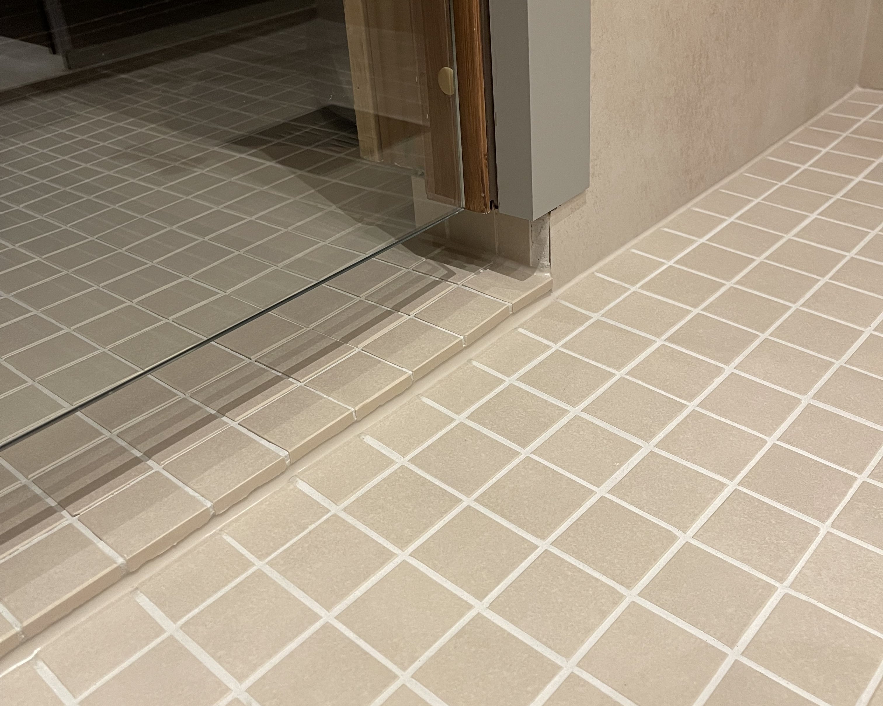 Puhdistustyössä käytettiin ammattitason aineita ja mekaanisia menetelmiä, joilla lika irrotettiin turvallisesti ja perusteellisesti ilman pintamateriaalien vaurioitumista. Suihkulattian saumat palautuivat jälleen vaaleiksi ja yhtenäisiksi, ja lasiseinän alareunan pinnat saatiin puhdistettua tarkasti kaikista kertymistä.